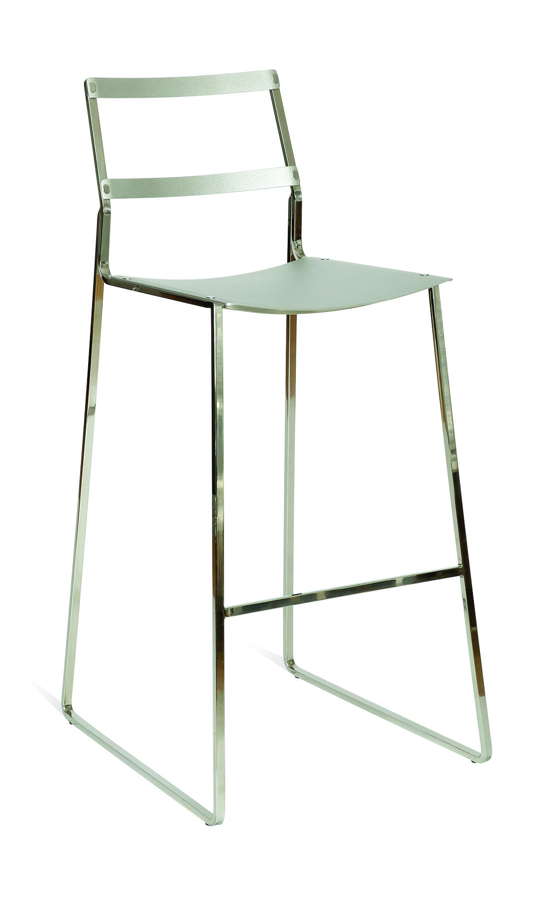 Flat steel rod frame and back with a solid seat, chrome finish. Skid legs for added stability.